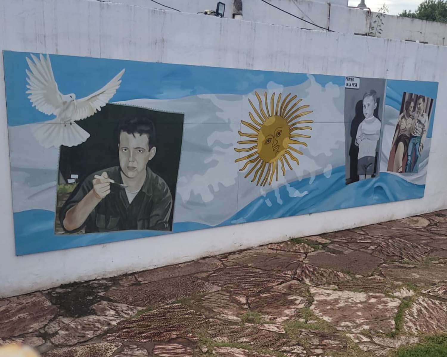 Una de las paredes laterales del frente de la Escuela Gral. San Martín lo recuerdan con un mural que refleja el paso del pequeño “Busto” por las aulas de ese colegio emplazado en barrio Rivadavia.