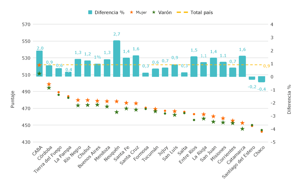 Las mujeres suelen tener mejores resultados en Lengua que los varones, tanto en primaria como en secundaria. Mientras que los varones obtienen mejores resultados en Matemática que las mujeres. Además, las mujeres logran terminar en mayor proporción la secundaria que los varones (79% y 68%, respectivamente en 2023) en el grupo etario entre 25 y 29 años.
