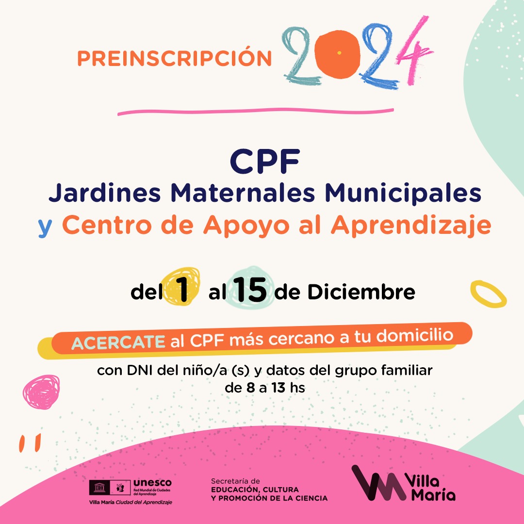 La Municipalidad habilitará las preinscripciones escolares para el próximo Ciclo Lectivo a los Centros de Promoción Familiar (CPF). Comprenden todos los jardines maternales y el Centro de Apoyo al Aprendizaje Ramón J. Cárcano.