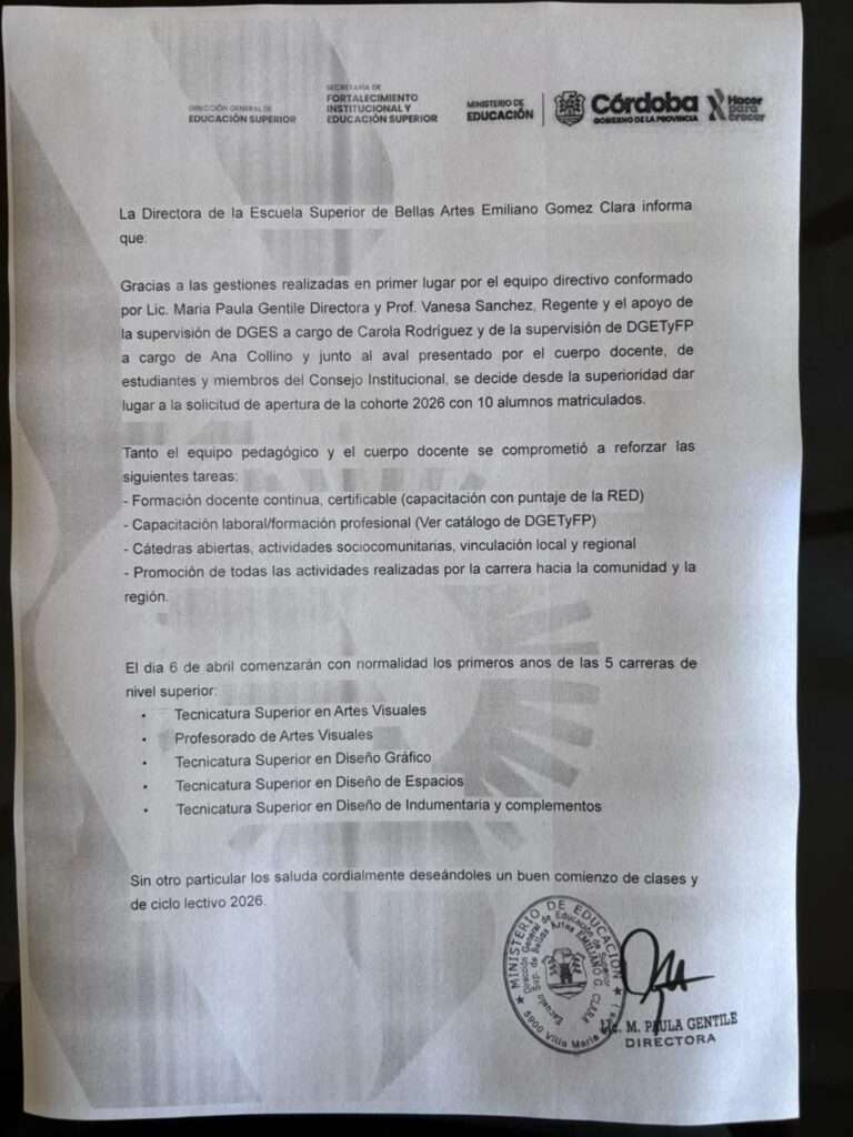 La cohorte 2026 de 1° Año de la Tecnicatura en Artes Visuales de la Escuela Superior de Bellas Artes comenzará el lunes 6 de abril. De manera “excepcional” las autoridades ministeriales dieron marcha atrás con el comunicado que la semana pasada anunciaba el congelamiento de esta cohorte anual.