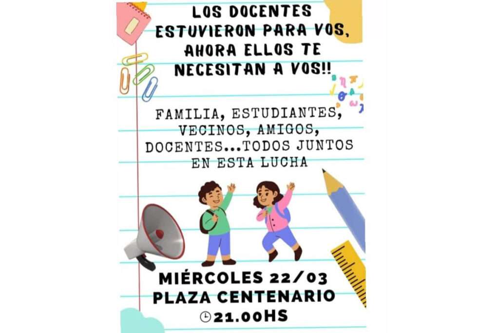 Por otra parte, el grupo de autoconvocados denominados “Docentes en lucha” convocan por redes sociales para la noche de este miércoles desde las 21 a Plaza Centenario a familias, estudiantes, vecinos y amigos a reclamar por el bajo salario docente. Junto con trabajadores y trabajadoras de la salud.
