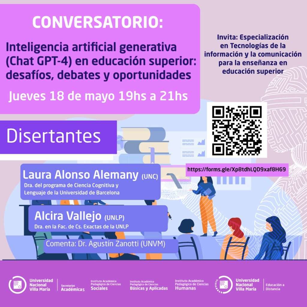 Este jueves 18 de mayo tendrá lugar el Conversatorio: Inteligencia Artificial generativa (Chat GPT-4, dall-e) en educación superior: desafíos, debates y oportunidades.
