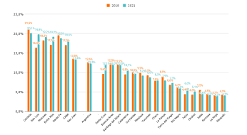 Por otro lado, entre 2018 y 2021, 12 distritos aumentaron la proporción del presupuesto educativo destinado a transferencias al sector privado, mientras que otros 12 lo redujeron. Las mayores reducciones fueron en Córdoba (-1,3 pp), La Pampa (-1,0) y Salta (-0,9 pp). Aunque para 2021 sigue siendo una de las provincias que más destina financiamiento a este sector.