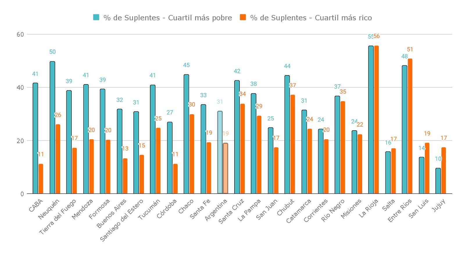 A nivel nacional, la mayor proporción de docentes suplentes se da en las escuelas primarias a las que asisten los estudiantes del cuartil de nivel socioeconómico más bajo. En 19 jurisdicciones la proporción de docentes suplentes es mayor en las escuelas del cuartil más pobre que en las del más rico. En cambio, esta brecha no se verifica en La Rioja, Entre Ríos, Salta, San Luis y Jujuy.