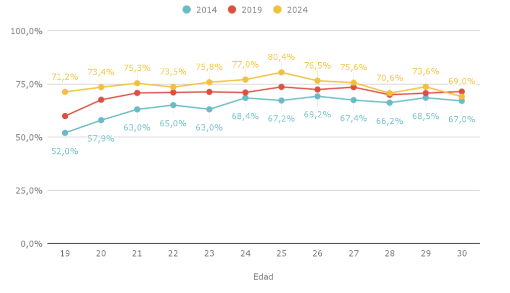 Al poner el foco en la secundaria, se ve que los mayores avances en la finalización de este nivel, fueron en las edades más tempranas: entre los jóvenes de 19 años, la proporción de graduados pasó del 52% en 2014 al 71,2% en 2024. En tanto, entre los de 30 años, la tasa de finalización se mantiene estable en torno al 70%.