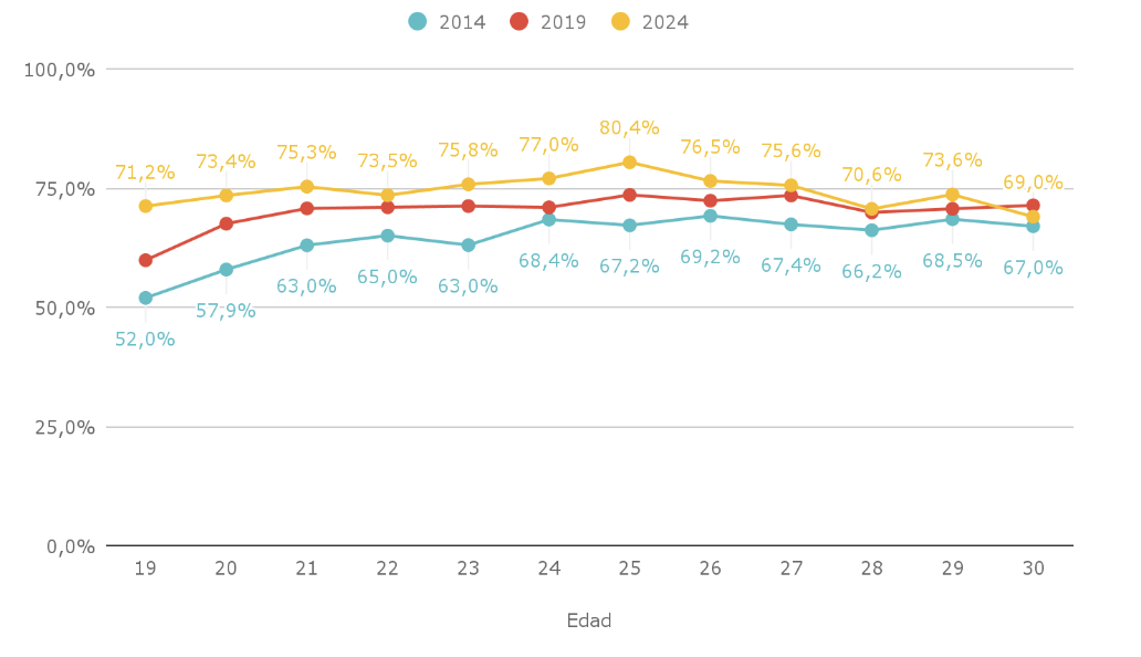 Al poner el foco en la secundaria, se ve que los mayores avances en la finalización de este nivel, fueron en las edades más tempranas: entre los jóvenes de 19 años, la proporción de graduados pasó del 52% en 2014 al 71,2% en 2024. En tanto, entre los de 30 años, la tasa de finalización se mantiene estable en torno al 70%.