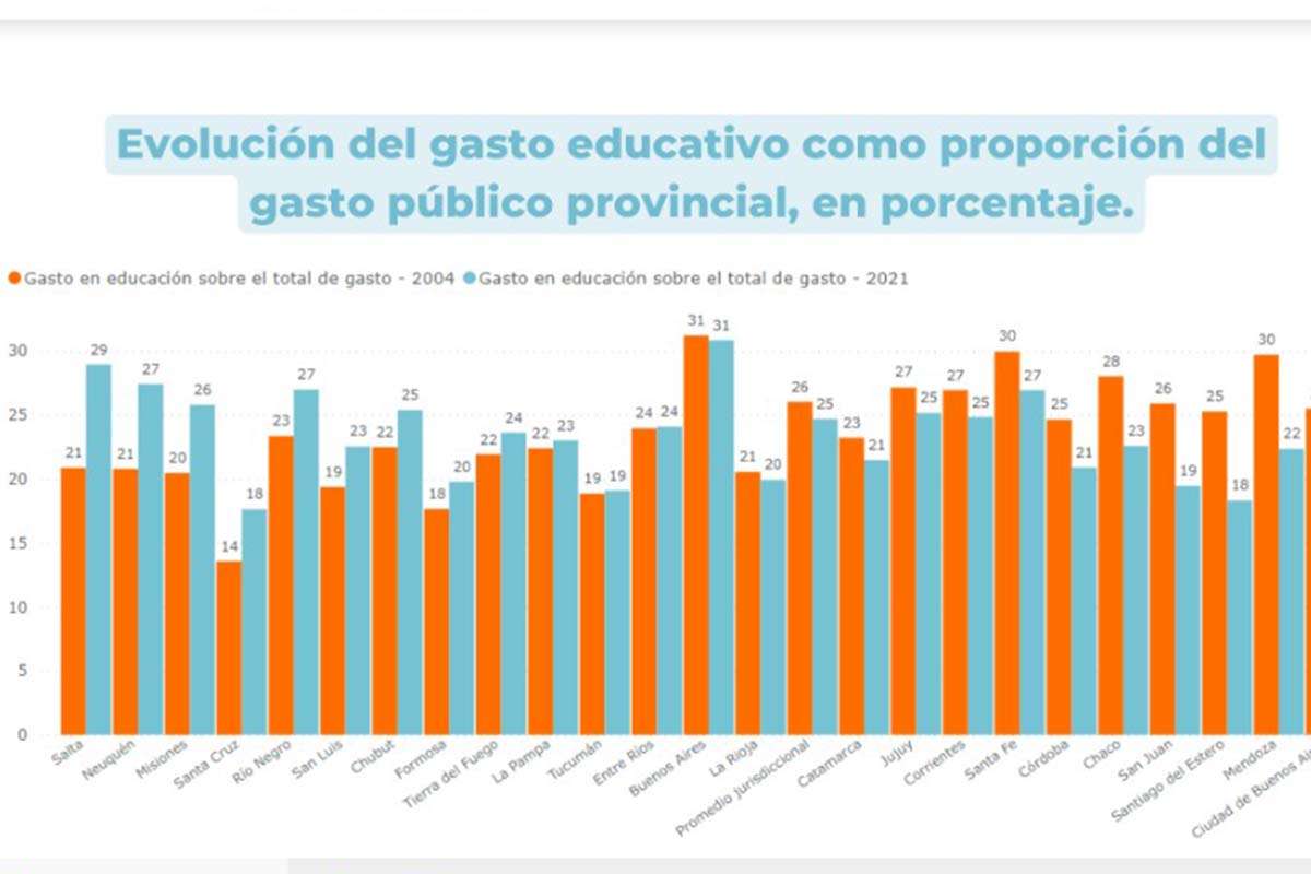 El informe considera el total del gasto educativo, sin importar qué ministerio ejecuta el presupuesto. De acuerdo con ese indicador, en 2021 las dos jurisdicciones que dedicaron mayor proporción de su presupuesto a la educación fueron Buenos Aires (30,8%) y Salta (28,8%). Por otro lado, las que menos presupuesto asignaron con respecto a su presupuesto total fueron CABA (16,7%) y Santa Cruz (17,6%).