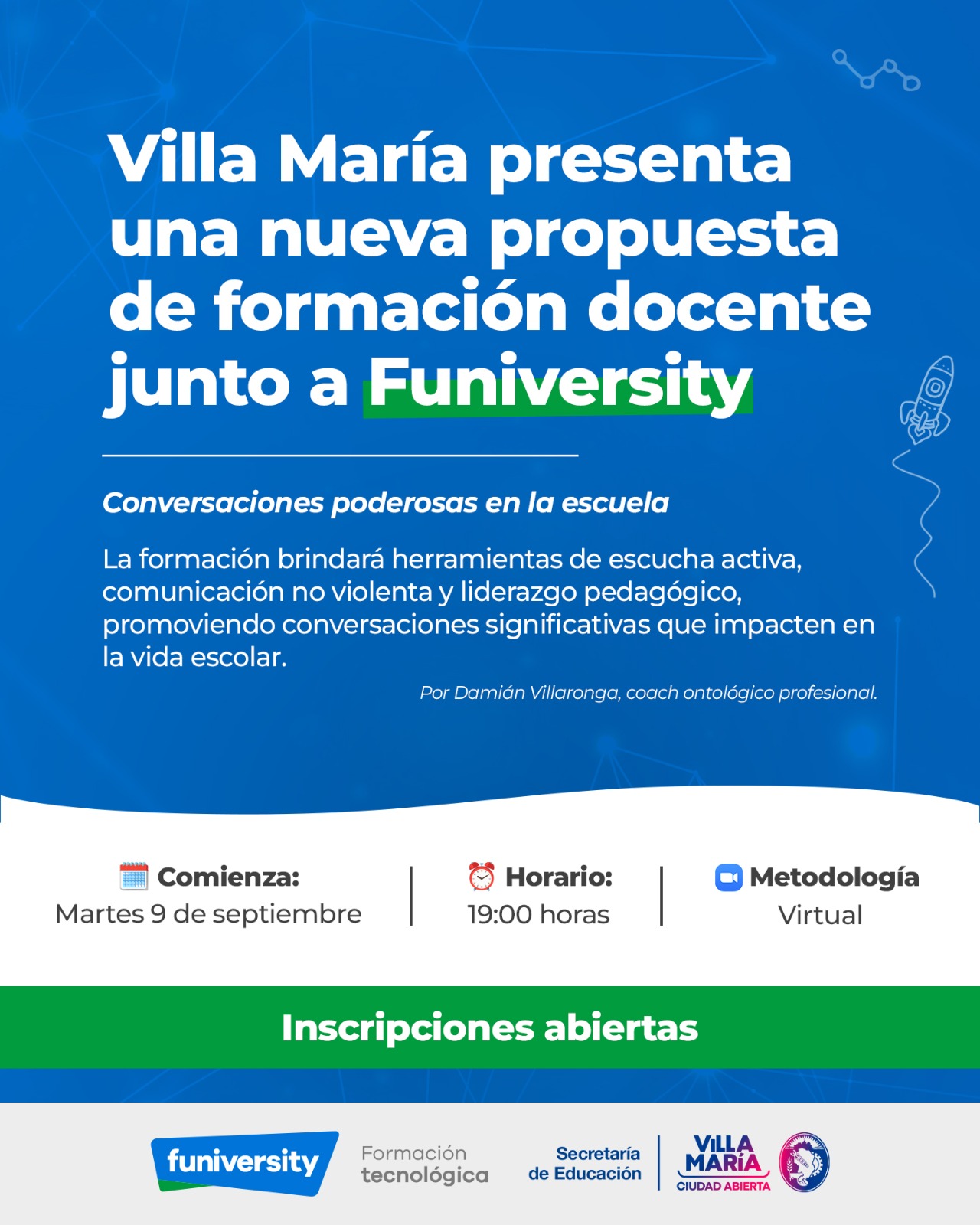 La Municipalidad de Villa María, a través de la Secretaría de Educación, lanza una nueva instancia de capacitación para docentes y directivos, en articulación con Funiversity. La iniciativa busca fortalecer habilidades comunicativas en el ámbito escolar, promoviendo vínculos saludables y contextos de aprendizaje enriquecedores.