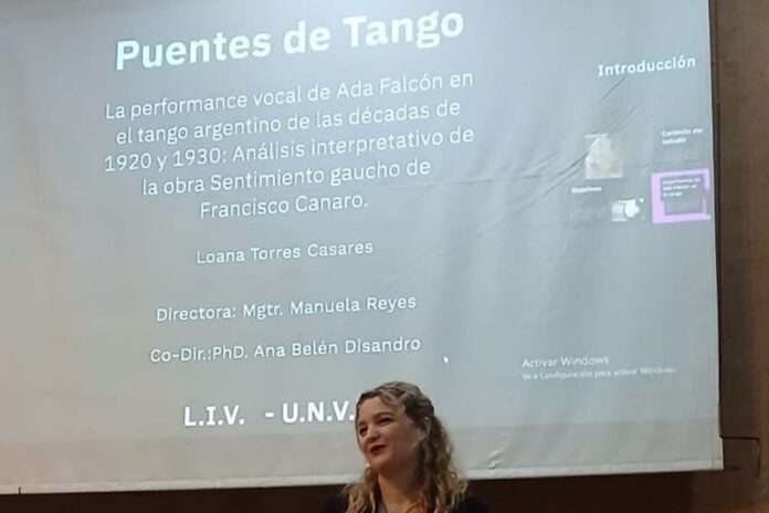 Comenzó a cursar en 2021 y ya, en aquellos momentos, sus genes arraigados al tango, al ingresar a la UNVM, empujaban para que su TFG tuvieran que ver con sus raíces. Y así fue: nació y se desarrolló «PUENTES DE TANGO. La performance vocal de Ada Falcón en el tango argentino de las décadas de 1920 y 1930: Análisis interpretativo de la obra Sentimiento Gaucho, de Francisco Canaro», un aporte que combina interpretación, historia y sensibilidad artística.