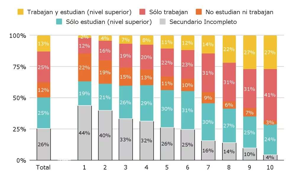 Las oportunidades educativas y laborales se ven marcadas por los recursos económicos. Entre los jóvenes del decil más alto, son más los que logran concretar sus expectativas: el 51% se dedica a estudiar (el 27% solo estudia y el 24% también trabaja), mientras que el 68% trabaja (41% solo trabaja, y 27% trabaja y estudia en el nivel superior). En cambio, en los sectores más bajos, el porcentaje de quienes siguen estudiando disminuye a 21%: el 19% solo estudia y el 2% también trabaja, mientras que un 12% solo trabaja.