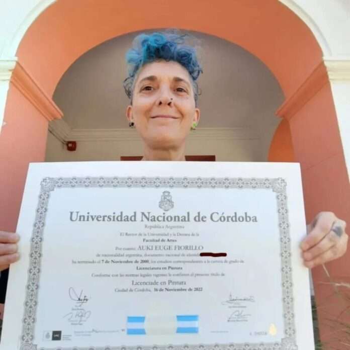 El diploma universitario fue rectificado con el nombre de Auki Euge Fiorillo, a quien se reconoce como Licenciade en Pintura de la Facultad de Artes de la UNC.