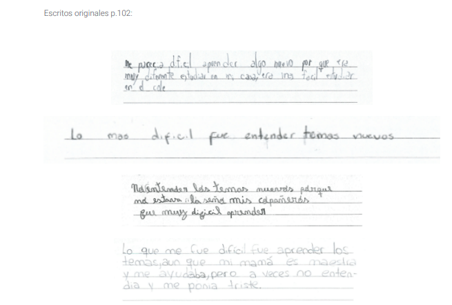 En este último grupo, atribuyen el hecho de haber aprendido menos a diferentes aspectos del aprendizaje en la virtualidad, como la dificultad para entender las tareas en soledad, el aburrimiento o la desconcentración y, algunas y algunos estudiantes, a que se enseñaron menos temas durante este periodo.