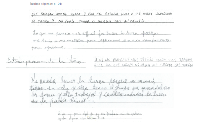 Principalmente, las y los estudiantes se refirieron a la dificultad que implicó aprender, comprender y comunicarse en el novedoso contexto de la pandemia. Por otro lado, uno de los conceptos más recurrentes fue “hacer la tarea”.