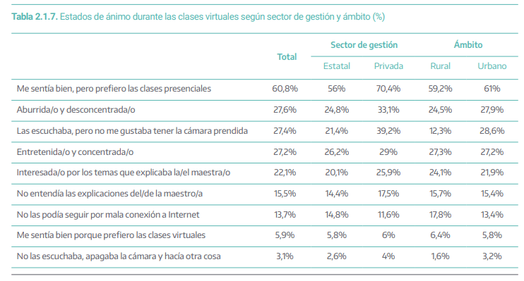 O Escuchaba, pero no me gustaba tener la cámara prendida (27,4%), Entretenida/o y concentrada/o (27,2%), No las podía seguir por mala conexión a Internet (13,7), Interesada/o por los temas que explicaba la/el maestra/o (22,1%), No entendía las explicaciones del/de la maestra/o (15,5%), y Me sentía bien porque prefiero las clases virtuales (5,9%).