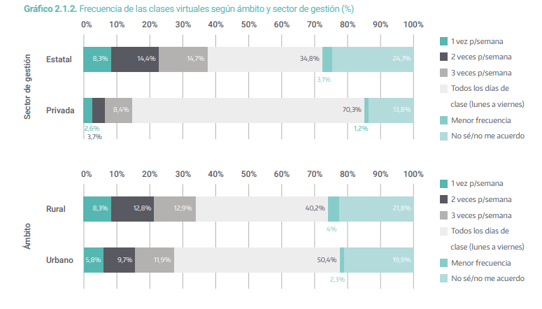 Sobre la frecuencia, entre quienes respondieron haber tenido clases virtuales en vivo durante la pandemia, el 50% respondió que la frecuencia fue diaria (de lunes a viernes), el 27,7% entre 1 y 3 veces por semana, y el 20% no lo sabe o no lo recuerda.