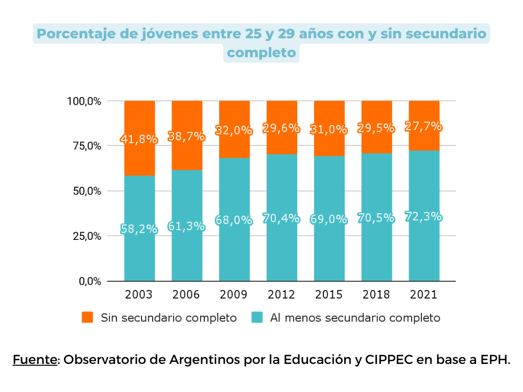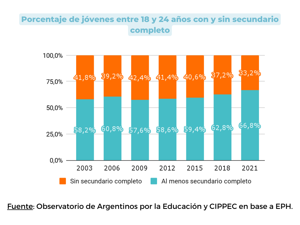 También creció el porcentaje de graduados del nivel: la proporción de jóvenes que completaron la secundaria aumentó 14 puntos porcentuales entre 2003 y 2021.