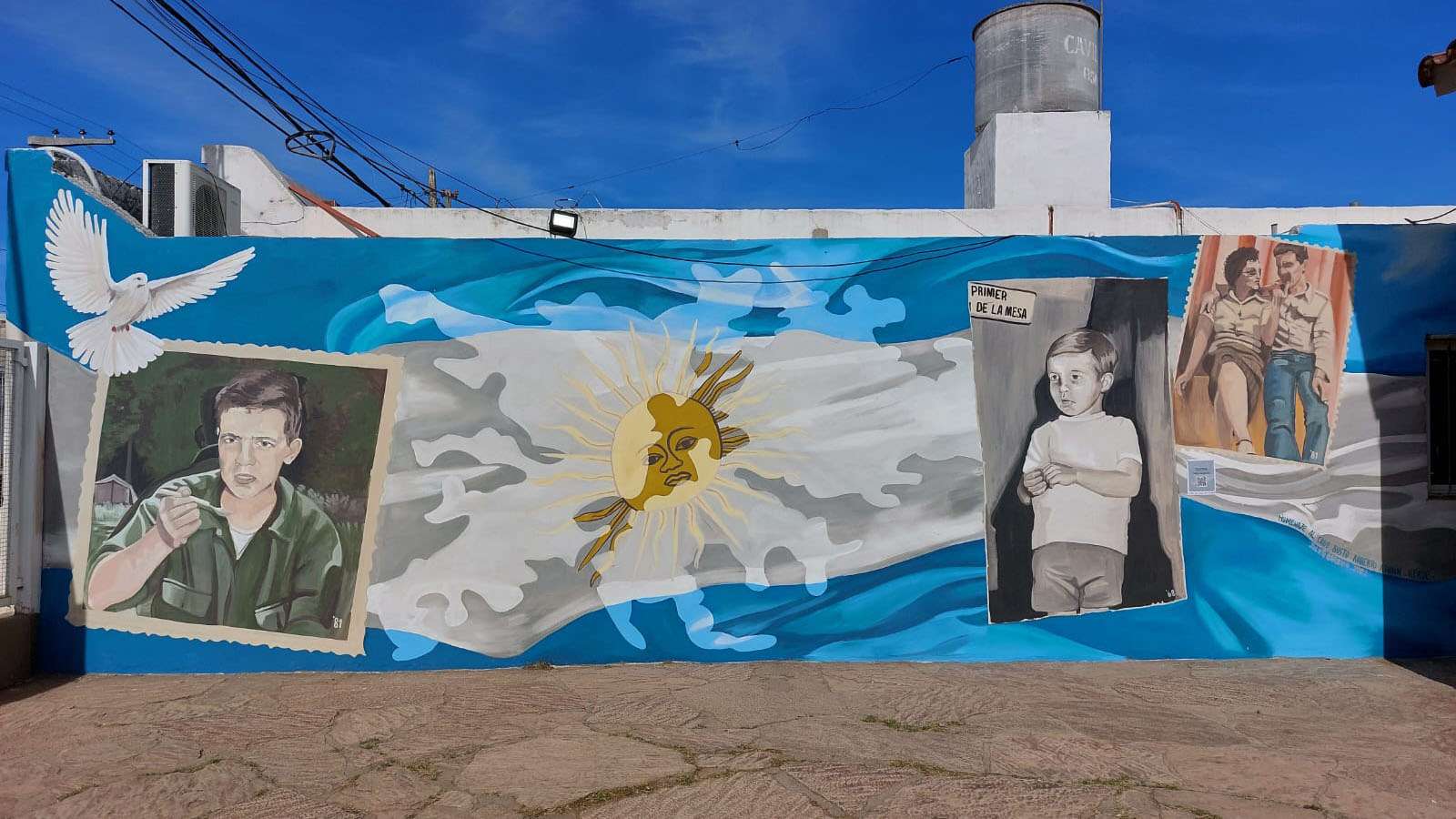 Julieta Barbuio, la artista que creó esta obra, entre mate y mate con Gladis, la hermana de Roberto, fue generando la sabia que maduró en mural repasando la infancia de este joven soldado. “Sentí un gran compromiso al ser convocada por Patrimonio Histórico”, nos dice.