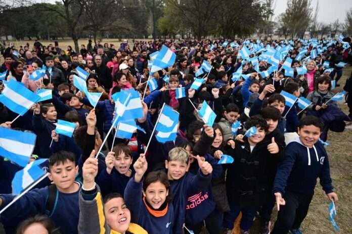 Alumnos y alumnas de las escuelas primarias de la ciudad se unieron a los pies del monumento que recuerda a Manuel Belgrano para prometer lealtad a la Bandera Nacional.