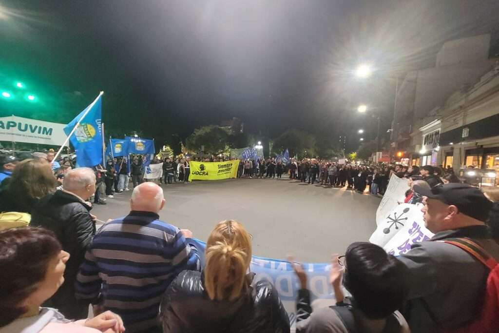 Desde las 18.30 se fueron concentrando distintos gremios, organizaciones y vecinos de la ciudad en la plaza céntrica para seguir el acto y la movilización que se realizó al final, entrada ya la noche. Los cuerpos orgánicos de la UEPC y el SADOP acompañaron la concentración con cánticos y banderas sectoriales.
