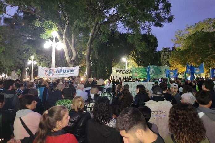 Desde las 18.30 se fueron concentrando distintos gremios, organizaciones y vecinos de la ciudad en la plaza céntrica para seguir el acto y la movilización que se realizó al final, entrada ya la noche. Los cuerpos orgánicos de la UEPC y el SADOP acompañaron la concentración con cánticos y banderas sectoriales.