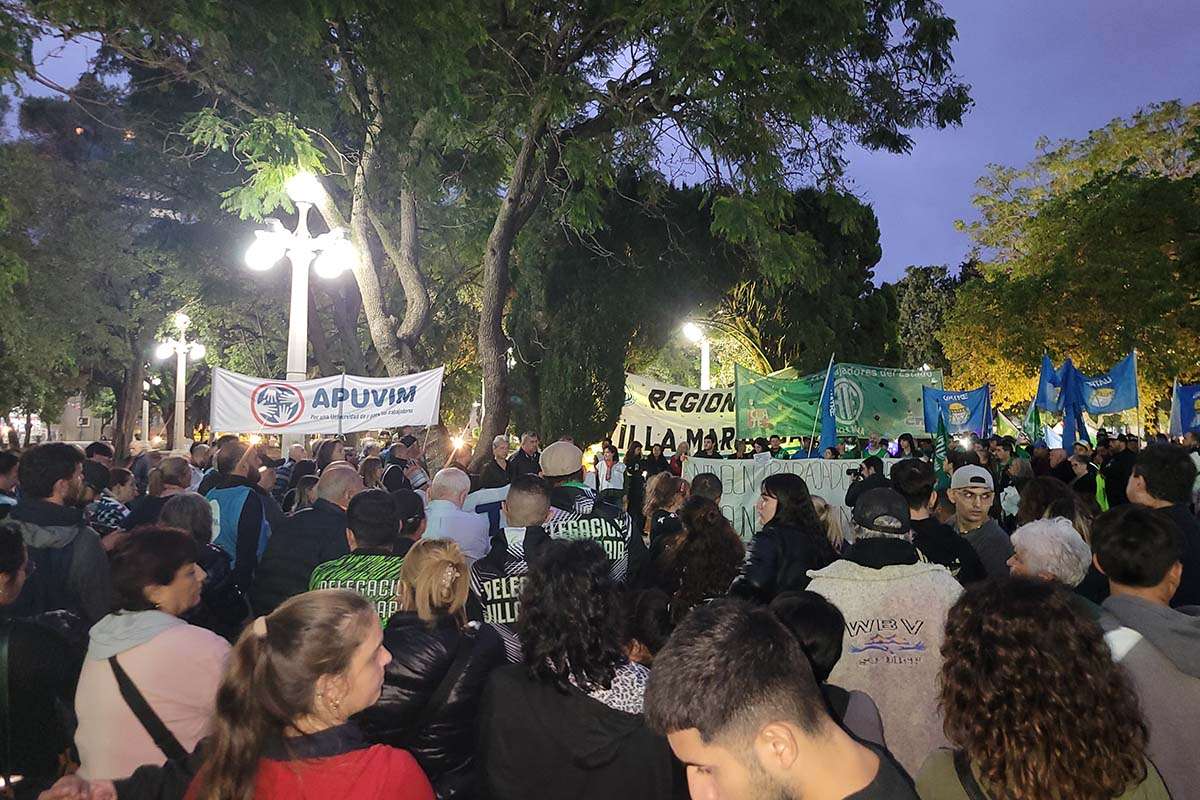 Por su parte, convocados cerca de las 18, la comunidad universitaria de la UNVM se concentró frente al Rectorado y marcharon por Entre Ríos, y de ahí por San Martín, hacia el microcentro. Unas 40 personas nutrieron esta columna, entre estudiantes, noDocentes (APUVIM), Docentes (ADIUVIM) y muy pocos funcionarios, más otro grupo de universitarios que aguardaban en la plaza.