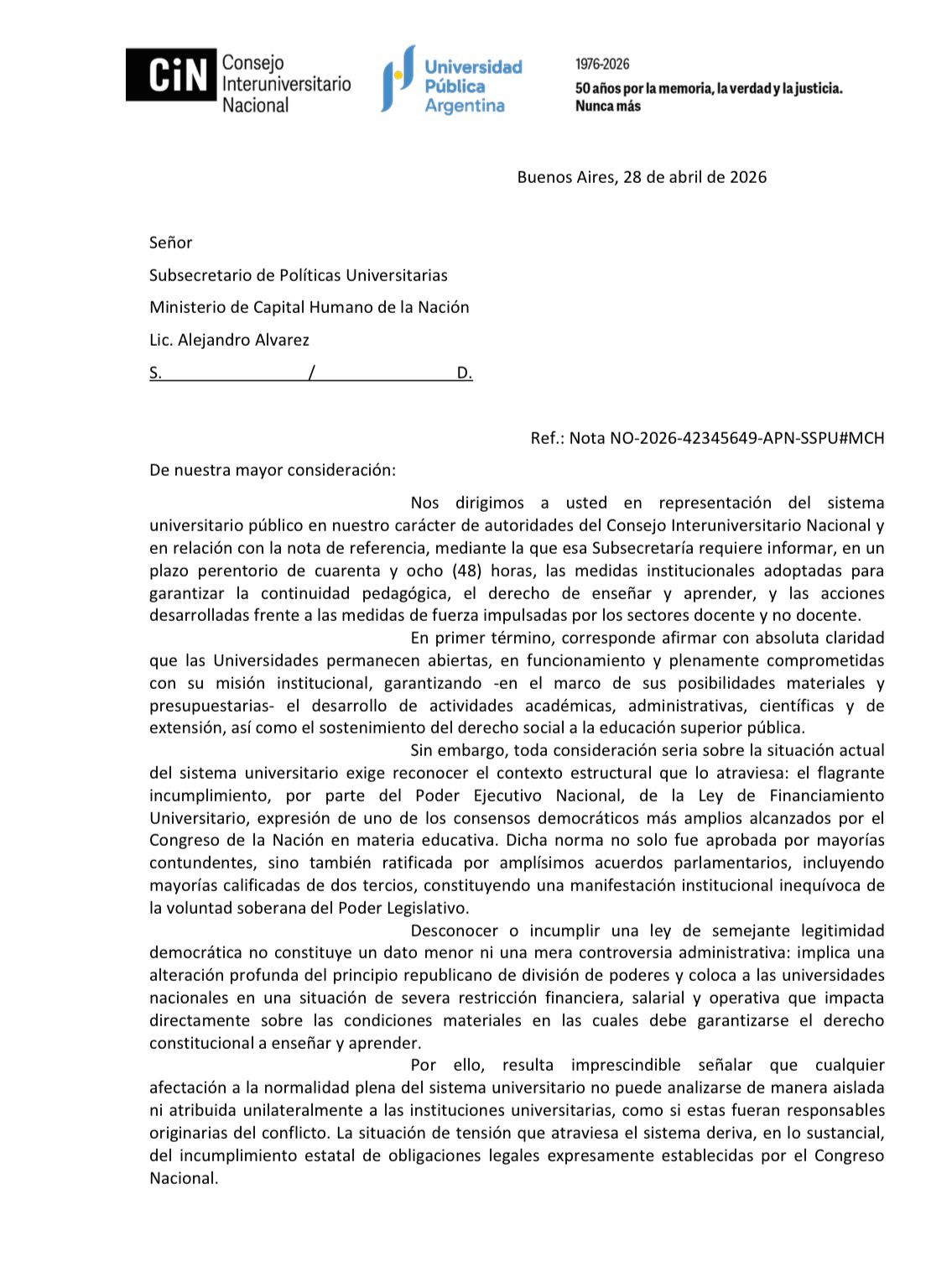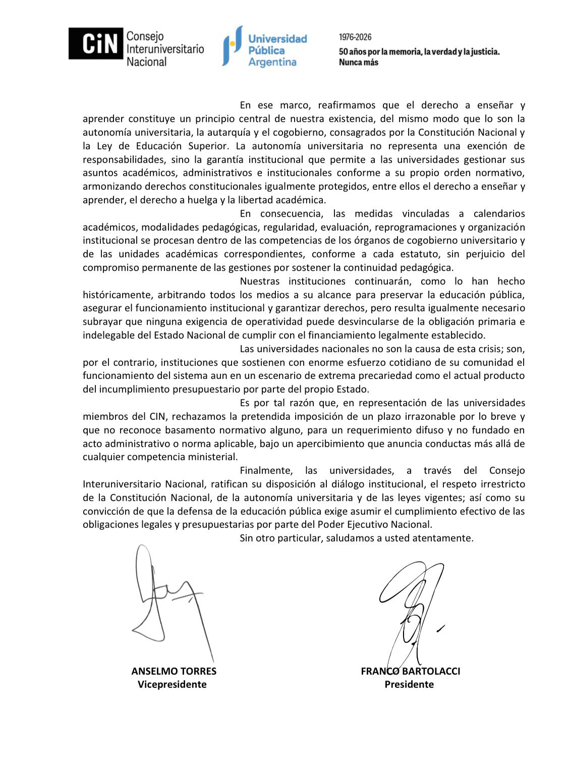 A última hora, y después de un zoom donde participaron rectoras y rectores de casi todo el sistema, se elaboró esta contestación, que lleva la firma del presidente Franco Bartolacci y de Anselmo Torres, vicepresidente del CIN.