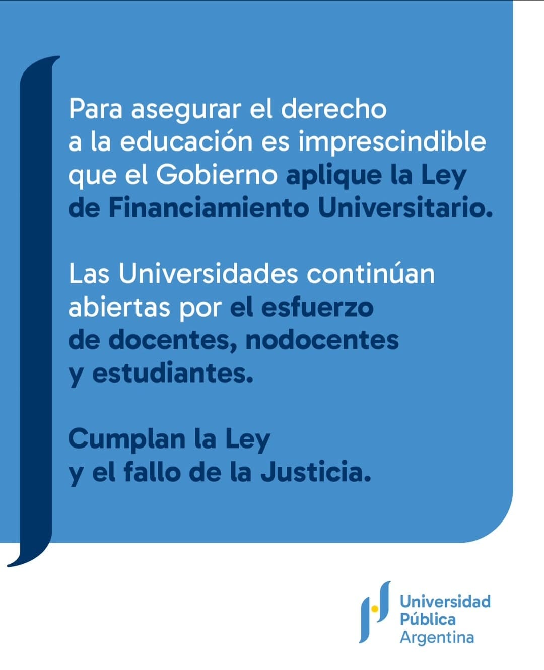En las redes sociales de las universidades, publicaron este mensaje, que continúa detallando: “El problema que atraviesan las Universidades Nacionales es grave y extremadamente delicado. La responsabilidad de financiar el sistema universitario es del gobierno nacional. Cumplir la ley y los fallos judiciales son requisitos indispensables para el funcionamiento del sistema democrático”.