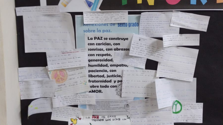 ¿Qué aportaríamos cada uno para conseguir esa paz?, le preguntaron a los alumnos y alumnas. “Muchos pusieron respeto, amistad, compañerismo, tolerancia, juegos, cariño y está bueno porque esas palabras son de niños”, describe Tymoszczuk.