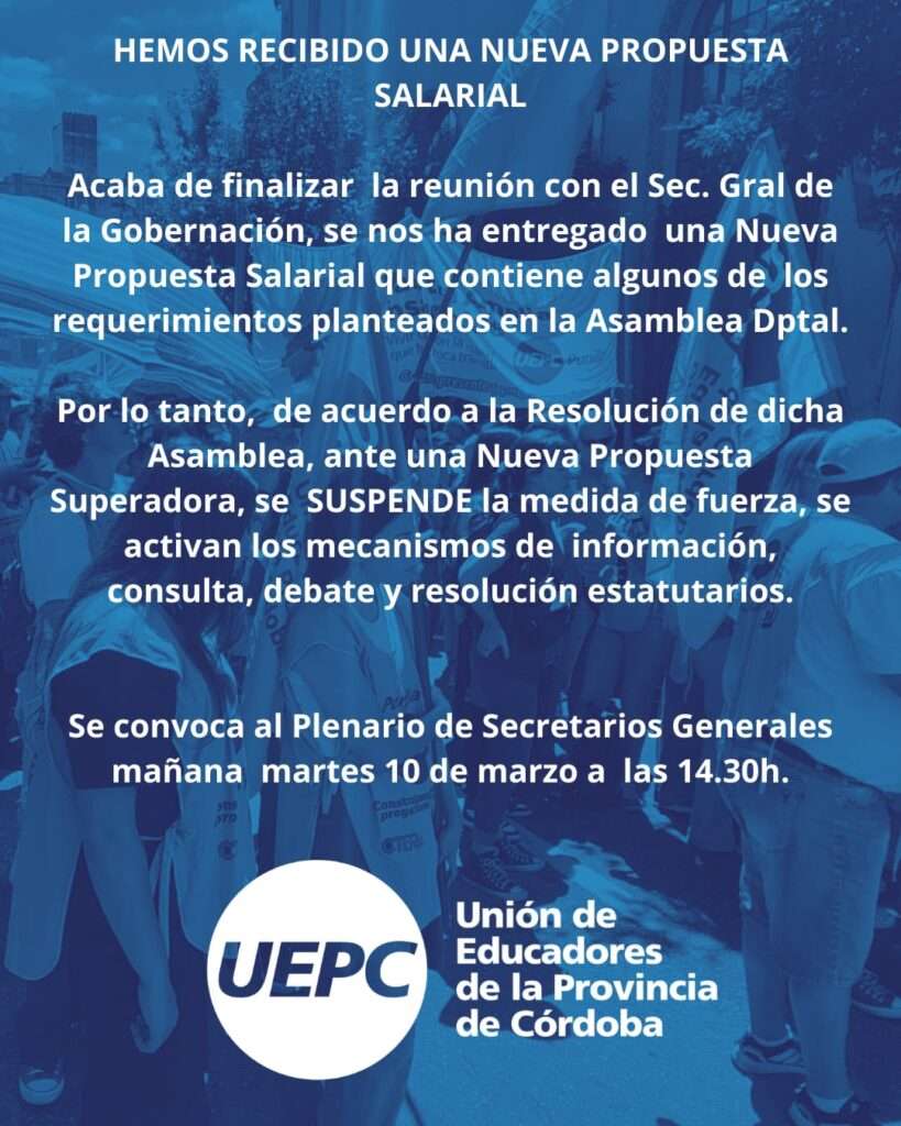 Se suspende el paro docente llamado para el miércoles 12 de marzo ante una nueva propuesta salarial del Gobierno de Córdoba que “contiene algunos de los requerimientos”, dijo UEPC. Este martes se reúnen en plenario las y los secretarios generales (14.30) y se activan los mecanismos de consulta con asambleas escolares, departamentales y la provincial resolutiva.