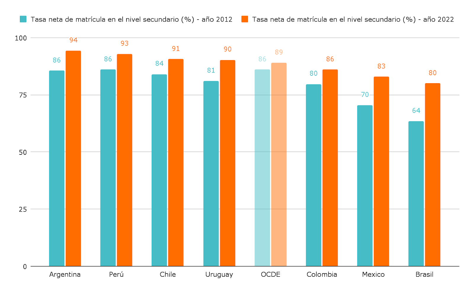 Argentina es el país de la región con la mayor tasa de matrícula neta en la secundaria: el 94% de los chicos asisten a la escuela, según los datos de 2022. Le siguen Perú (93%) y Chile (91%) En 2012, las tasas eran de 86% en Argentina y Perú y 84% en Chile. Otros países muestran avances, pero moderados: Uruguay pasó de 81% en 2012 a 90% en 2022, mientras que Brasil evidenció el mayor incremento, pasando del 64% en 2012 al 80% en 2022. Colombia y México también mostraron mejoras, alcanzando el 86% y 83%, respectivamente.