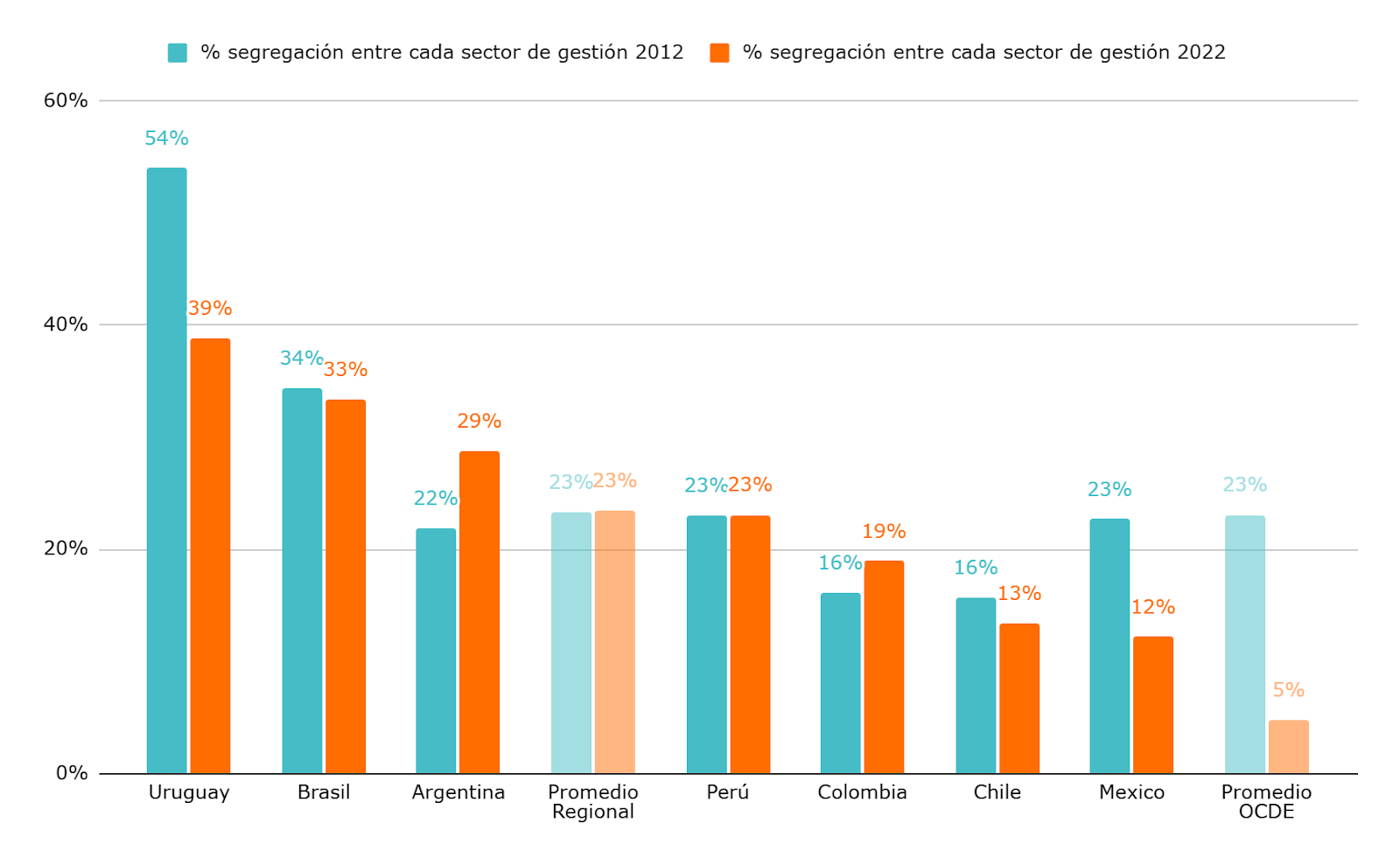 Si bien el acceso a la secundaria mejoró, los datos muestran que ese crecimiento no implicó necesariamente una mayor integración entre estudiantes de diversos extractos sociales. La segregación escolar se debe tanto a factores internos del sistema educativo como a la migración de sectores favorecidos hacia la educación privada. En América Latina, la segregación entre sectores de gestión fue del 23% en promedio en 2022, muy por encima del 5% registrado en los países de la OCDE.