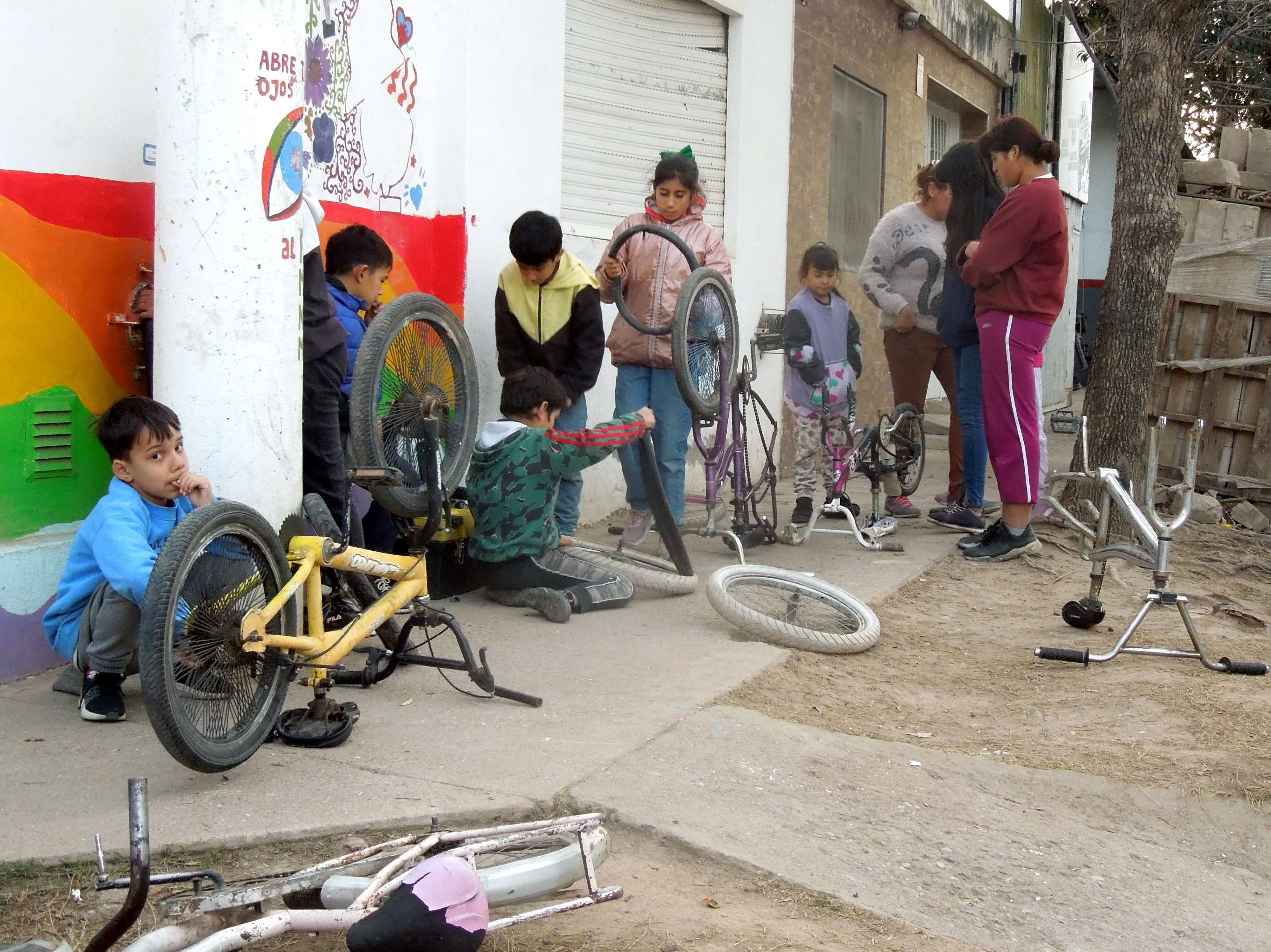 En el Centro Comunitario Pinceladas, las bicicletas se estacionan sobre la vereda, se dan vuelta, se desarman, se vuelven a armar. Víctor Juárez (43) dicta un Taller de Ciclomecánica desde el 2019 para chicos y chicas del barrio San Nicolás que llevan sus bicis y aprenden a arreglarlas. Pinchaduras, cadenas sueltas, cambio de cubiertas…