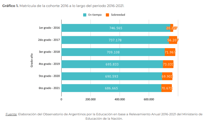 Por ejemplo, con el análisis de la cohorte 2016: en 1er grado en el 2016 entraron 746.565 estudiantes en edad teórica, quienes compartieron escuela con 20.267 estudiantes con sobreedad.