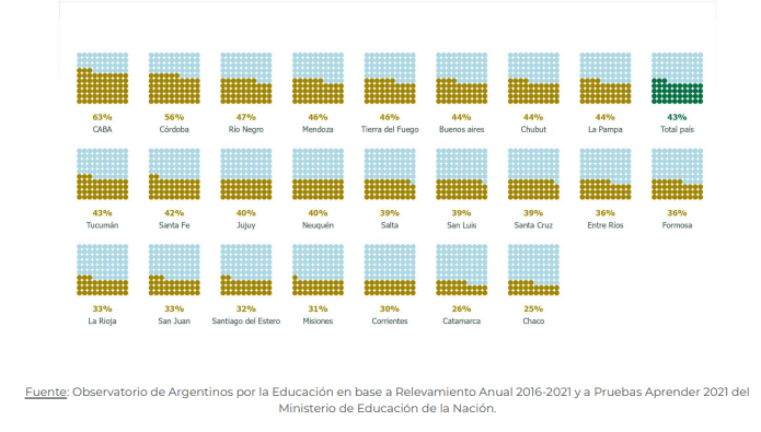 En este sentido, Córdoba se ubica segunda. Las tres provincias con mayor Índice de Resultados Escolares son: CABA (63%), Córdoba (56%) y Río Negro (47%). En el otro extremo se encuentran Corrientes (30%), Catamarca (26%) y Chaco (25%).