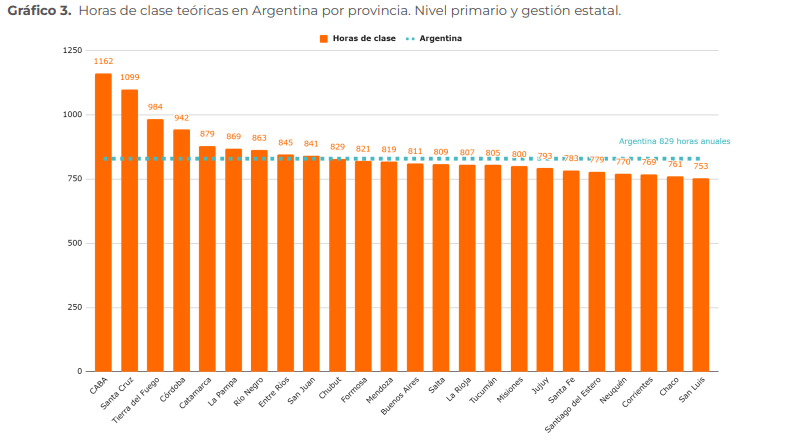 En cantidad de horas teóricas de clase, detrás de CABA y Santa Cruz se ubican Tierra del Fuego (984 horas anuales), Córdoba (942) y Catamarca (879).